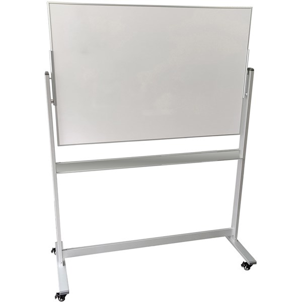 Double sided magnetic whiteboard pivots 360 degrees.