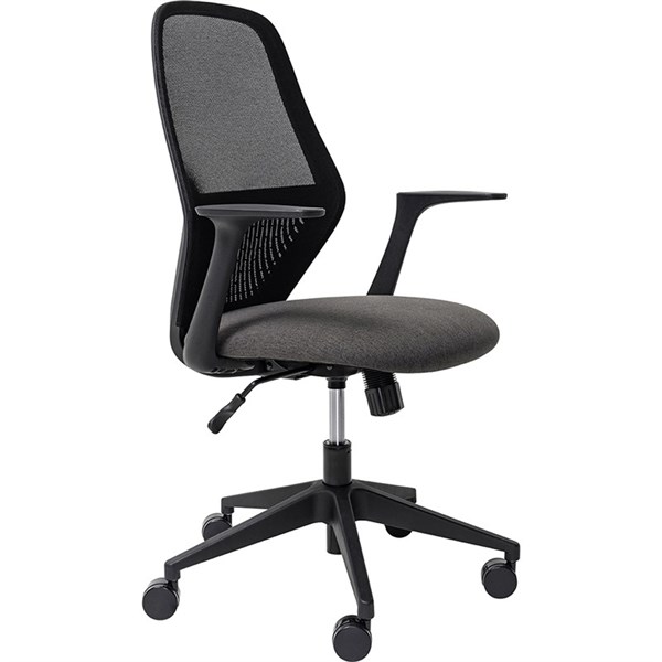 - Composition: Breathable mesh back and fabric upholstered seat.