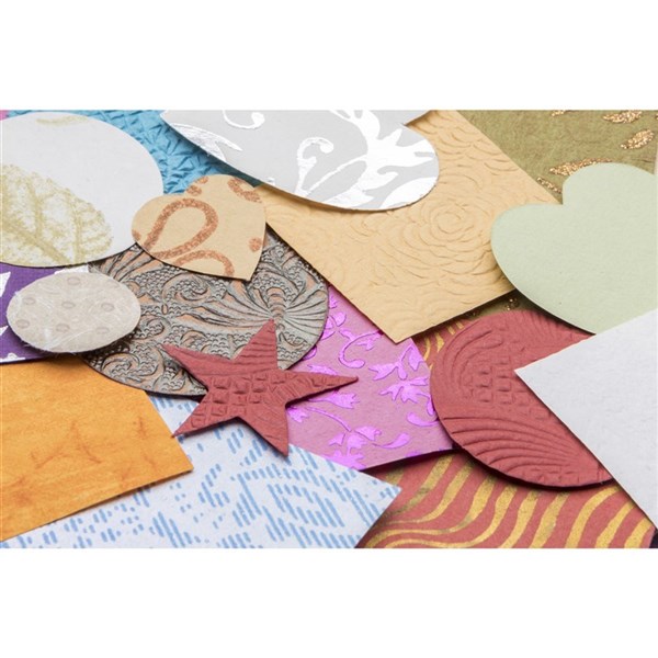 This stunning collection of Handmade Collage Shapes haveybeen cut from beautifully embossed, foiled and printed Indian handmade paper.