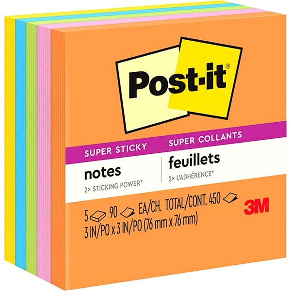 - Super Sticky Post-it® adhesive ensures that notes stick practically anywhere such as computer monitors, filing cabinets & furniture and remain as easily removable as original Post-it® Notes.
