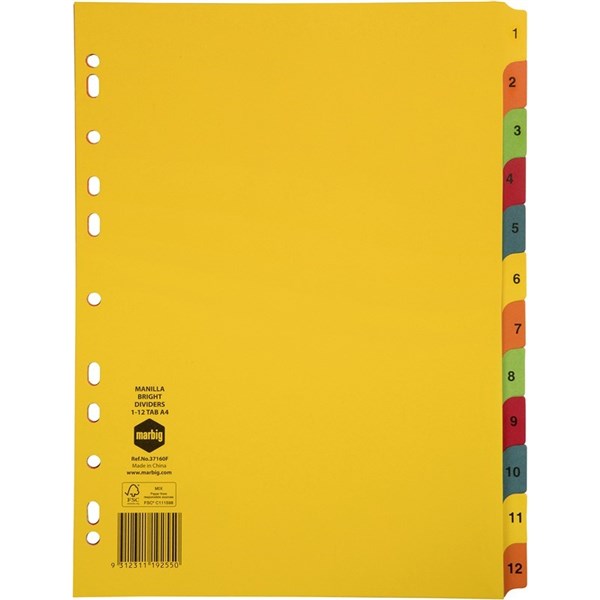 A4 DIVIDERS 1-12 TAB MANILLA BRIGHT DIVIDERS SET