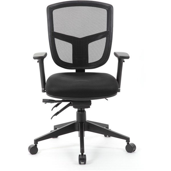 Medium back, adjustable seat height, adjustable arms and moulded foam seat with mesh back.