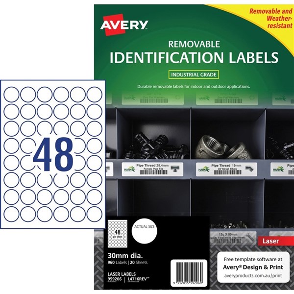 - Size: 30mm diameter 960 labels, 20 sheets. 48 labels per sheet (48UP).